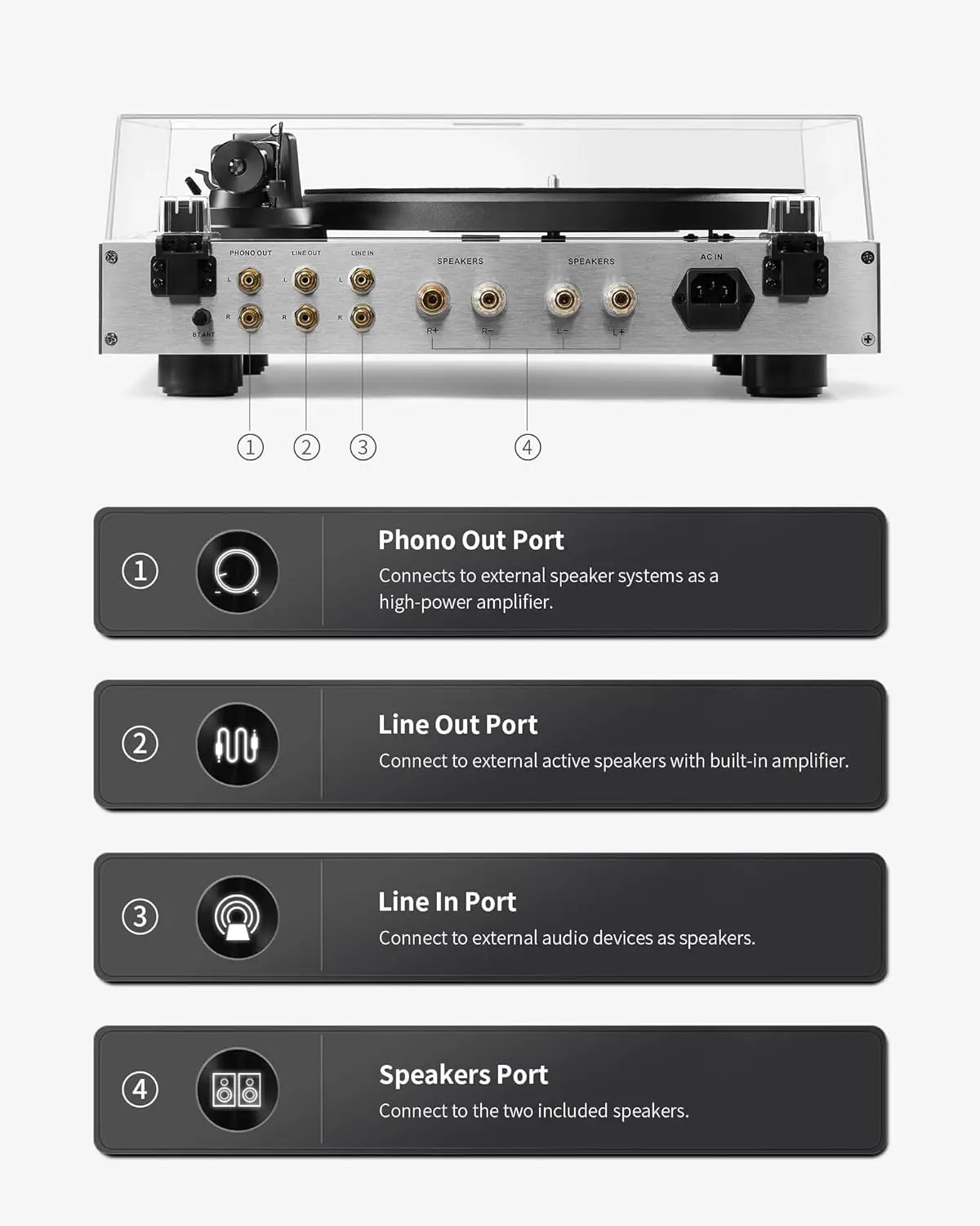 • Frequency Response: PHONO: 100Hz±10dB, 10kHz-13dB; Bluetooth: 100Hz-0dB, 10kHz-1dB